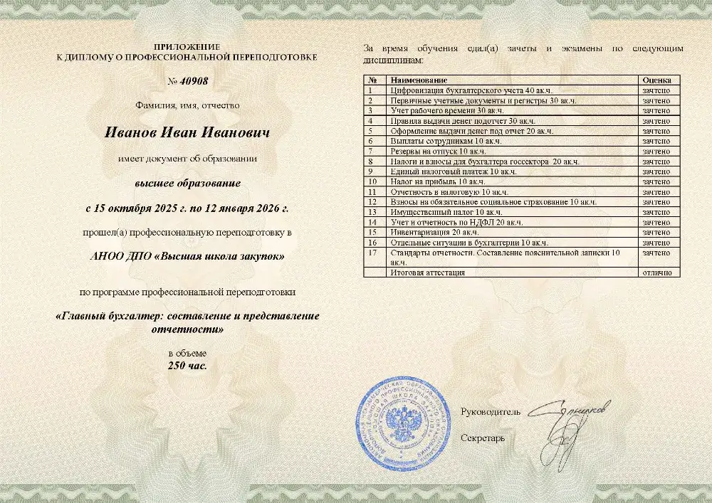 Диплом выдается в течение суток. Обучение полностью дистанционное, итоговая аттестация — тест из 10 вопросов, без временных ограничений, попытки не лимитированы. Запись в ФРДО производится в день выдачи.