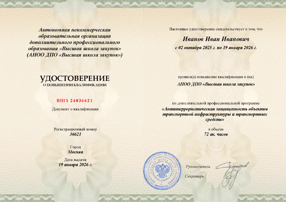 Курс повышения квалификации объемом 72 академических часа включает семь тематических разделов: нормативно-правовые основы противодействия терроризму, анализ угроз и рисков на транспорте, функциональные обязанности ответственных должностных лиц, инженерно-техническая укрепленность объектов, ведение документооборота, алгоритмы действий персонала при чрезвычайных ситуациях и практические аспекты взаимодействия с контролирующими органами. Обучение реализовано в заочной форме с применением дистанционных технологий. Сравнение цен на рынке показало: это предложение — абсолютный лидер по доступности среди аналогичных программ. Итоговый контроль знаний проходит в формате упрощенного теста: не более 10 вопросов, время не ограничено, количество пересдач — безлимитно. Подавляющее большинство слушателей завершают обучение с первого раза, при этом не требуется писать рефераты, готовить дипломные работы или проходить устные защиты. Удостоверение установленного образца оформляется в течение одного дня, а сведения о выдаче передаются в ФРДО сразу после оформления. Обучение в Махачкале и других городах проходит в индивидуальном графике без отрыва от основной деятельности.