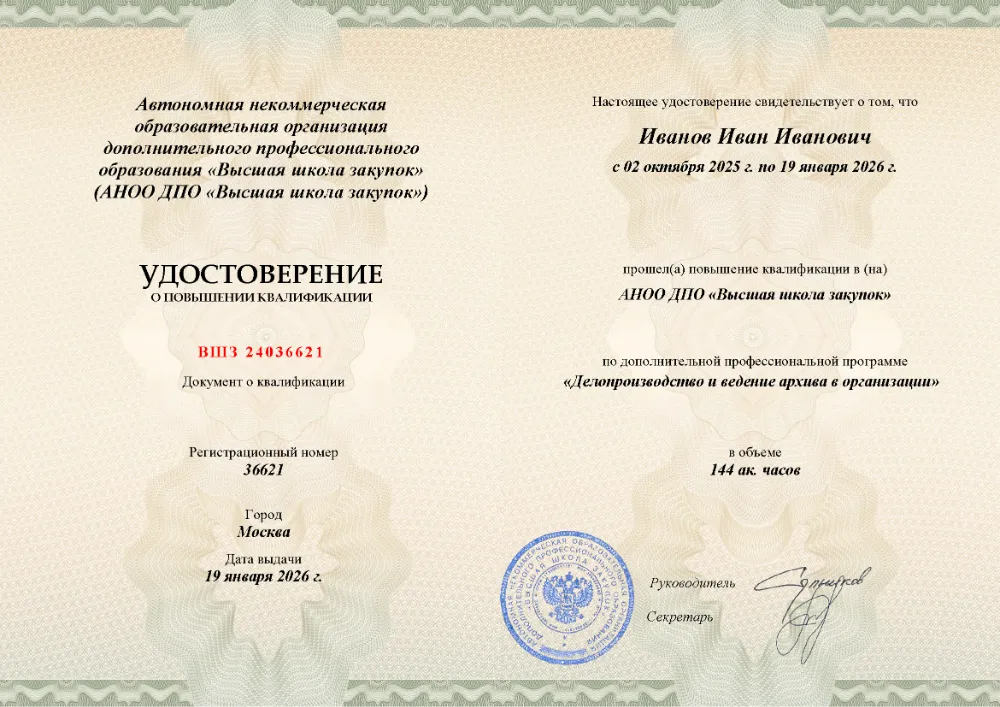Программа повышения квалификации рассчитана на 144 часа и посвящена организации полноценного документооборота: изучаются этапы подготовки служебной и кадровой документации, регламенты обращения с конфиденциальными сведениями, особенности международной переписки, а также принципы архивного хранения. Обучение организовано в дистанционном формате в Махачкале. По итогам мониторинга цен мы гарантируем: это предложение — самое доступное на рынке. Для завершения курса предусмотрена итоговая аттестация в виде несложного теста: не более 10 вопросов, время не ограничено, количество попыток — любое. Статистика показывает, что 99% участников проходят испытание с первой попытки. Никаких дополнительных работ — рефераты, дипломные проекты и устные защиты не требуются. Удостоверение установленного образца оформляется за 1 день, а сведения о нём вносятся в ФРДО непосредственно в день выдачи.
