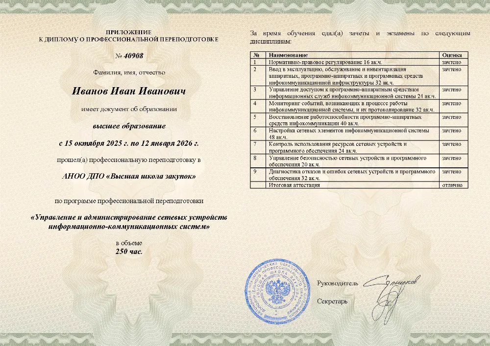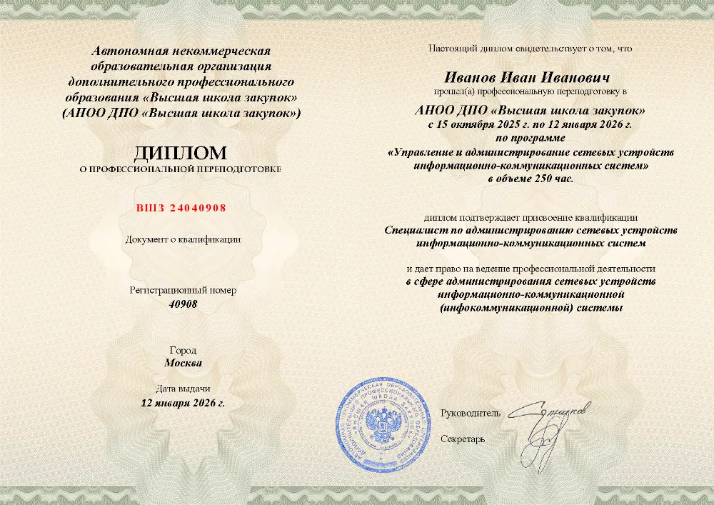 Профессиональная переподготовка, 250 академических часов, 9 модулей: нормативно-правовое регулирование и ввод в эксплуатацию, настройка и мониторинг сетевых устройств, управление доступом и безопасностью, диагностика и восстановление работоспособности инфокоммуникационных систем. Онлайн-обучение в в Махачкале с итоговой аттестацией.