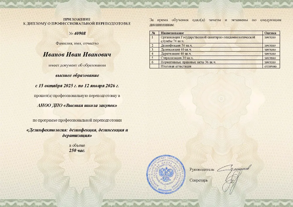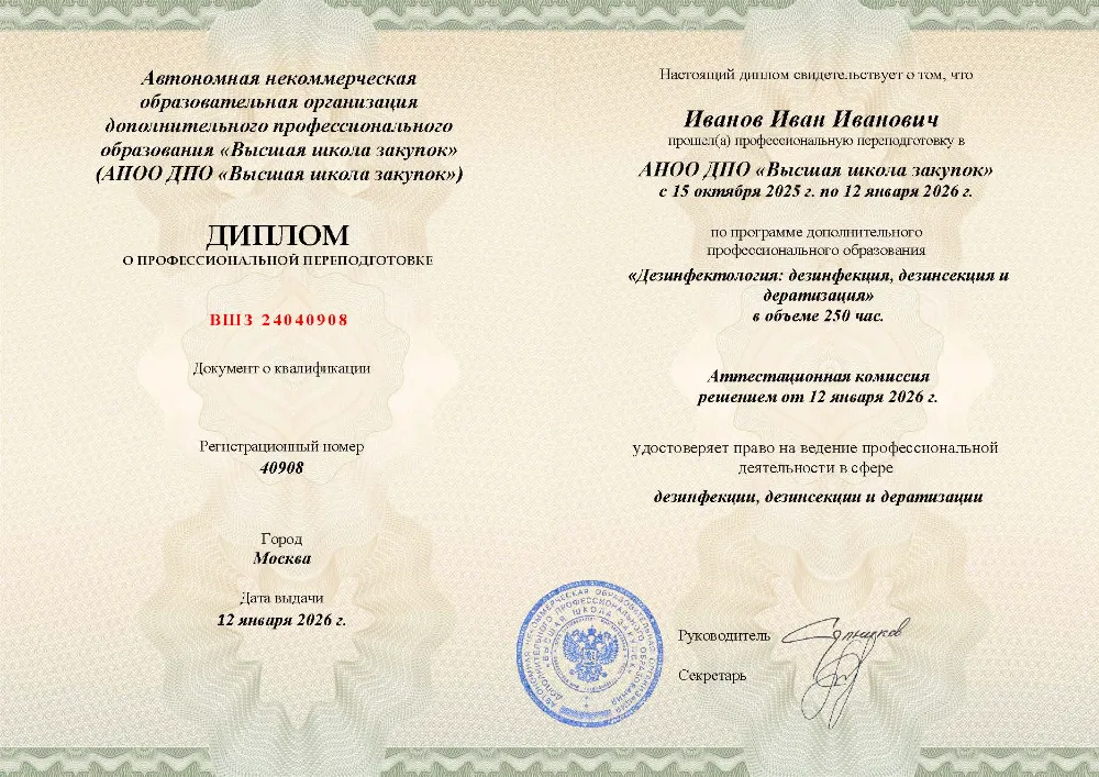 Курс профессиональной переподготовки объемом 250 академических часов разработан для сотрудников санитарно-эпидемиологических служб, дезинфекционных станций и профильных организаций. Обучение проходит дистанционно в Махачкале. Программа включает изучение основ работы санитарных служб, методов стерилизации и всех направлений обеззараживания: дезинфекции, борьбы с насекомыми (дезинсекции) и грызунами (дератизации). Учебный план имеет практическую направленность и охватывает актуальные правовые нормы. Аттестация максимально упрощена: онлайн-тест до 10 вопросов без лимита времени и количества попыток (99% слушателей справляются с первого раза). Никаких рефератов и защит работ. Мониторинг рынка подтверждает, что это наиболее бюджетный вариант обучения в своем сегменте. Диплом оформляется за 1 день, сведения в реестр ФРДО заносятся непосредственно в день выдачи.