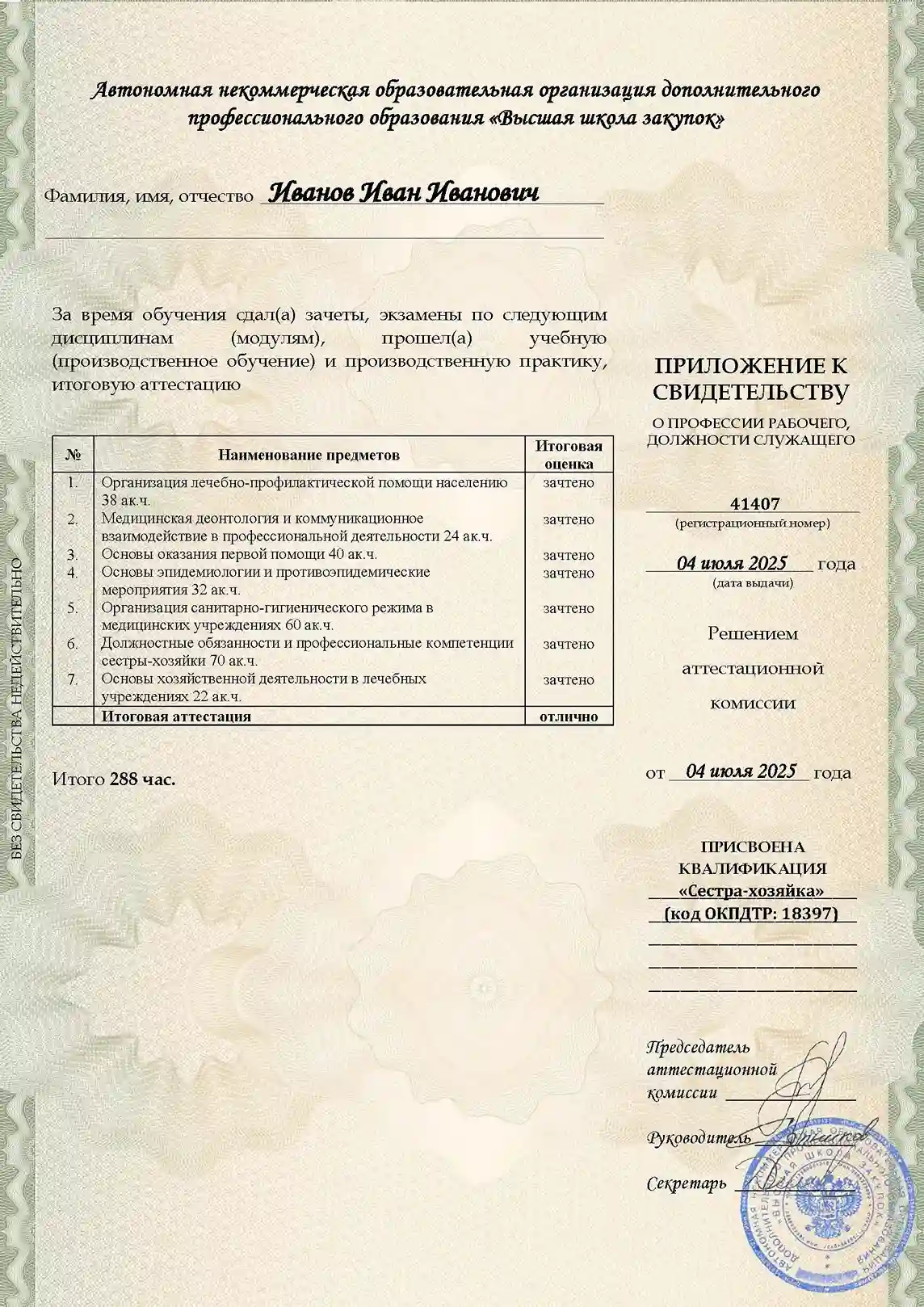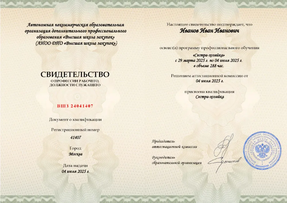 Программа профессионального обучения, содержащая 288 академических часов материала, предназначена для персонала, обеспечивающего санитарное содержание медицинских и социальных объектов. Заниматься можно полностью удаленно в Махачкале, совмещая учебу с работой. Курс охватывает должностные функции санитара, регламенты уборки помещений и обработки оборудования, правила транспортировки пациентов, а также нормы работы с медицинскими отходами и основы первой помощи. Итоговая аттестация проходит в формате несложного теста (до 10 вопросов) без ограничений по времени и количеству попыток (99% успешных сдач с первого раза). Рефераты и защиты исключены. Согласно анализу цен, это самый дешевый курс среди аналогичных программ. Диплом выдается за 1 день, а запись в ФРДО появляется в день выдачи документа.