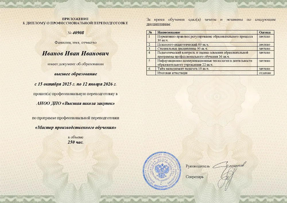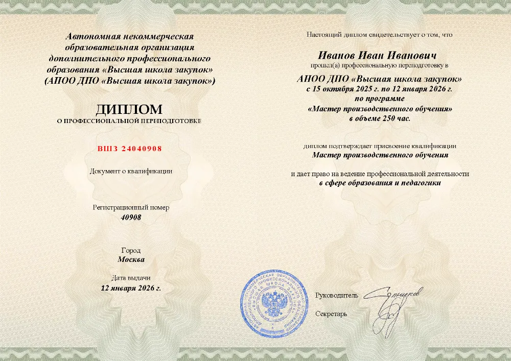 Данная программа профессиональной переподготовки, включающая 250 академических часов материала, разработана для специалистов, занимающихся подготовкой рабочих кадров в системе СПО и на предприятиях. Заниматься можно полностью удаленно в Махачкале, совмещая учебу с трудовой деятельностью. Курс охватывает нормативно-правовое регулирование образования, психолого-педагогические основы обучения, методику преподавания спецдисциплин, применение ИКТ и управление временем педагога. Аттестация проходит в формате несложного тестирования (до 10 вопросов) без ограничений по времени и количеству заходов (99% успешных сдач с первой попытки). Рефераты и защиты исключены. Согласно анализу цен, это самый дешевый курс среди аналогичных программ. Диплом выдается за 1 день, а запись в ФРДО появляется сразу в день выдачи документа.